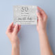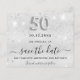 Observera att det här Spara datumet är pappert och mycket tunt. Kuvert ingår inte. Om du vill ha ett tjockare Spara datumkortet (samma design) kan du besöka vår butik. En elegant Spara datum för en 50:e födelsedagsfest. En modern faux silver tittar bakgrund som dekoreras med faux glitter-gnistor. Anpassa och lägg till datum och namn/ålder. Grått färgad brev. Texten: Spara datumet skrivs med ett stort trendig-handskript i stil. Nummer 50 med ett stil-teckensnitt med ballong.