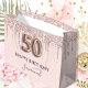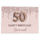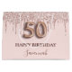 Elegant, klassisk, glamorös och giftig under 50:e födelsedagsfesten. rosa. Dekorerad med ro guld, rosa faux glitter droppar, färgdroppstift. Anpassa och lägg till ett namn. Med texten: Grattis på födelsedagen. Namn är skrivet med ett modernt skript för färgaden ro i mörk, skrivet med stil. Nummer 50 skrivs med ett stil-teckensnitt i ballong.