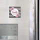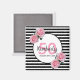En magnet för 50:e födelsedagsfesten. Klassiskt smalt svart och vitt vågrät rand som bakgrund. Med giftigt och feminin rosa ros som dekoration. Ett vitt och rosa ram på framsidan med mall för ålder, namn och datum. Åldersnummer i rosa, namn och datum i svart. Namn är skrivet med ett handskript i stil. Kan användas som en keepé, partiförmån eller som en sparpåminnelse för dina gäster