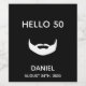 Ett modernt vin-märke för 50:e födelsedagsfesten för killar i svartvitt. Hej 50. Med en skägg. Mallar för namn och datum. Svart bakgrund färg.