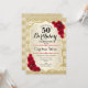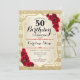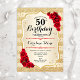 50-års inbjudan. Elegant design i guld och rött. Innehåller falska glitter guldränder, röda rosor stilfullt script-teckensnitt och konfetti. Perfekt för en glamourös födelsedagsfest.