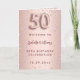 En falsk rose gold-gradientbakgrund med rosa diamanter. Namnet är skrivet med en modern, mörk rose gold-färgad handstilsmanuskript. Nummer 50 är skrivet med en ballongstil-font, manuskript. Välkomsttext, foto, meny och ett tack-kort på baksidan.