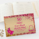 I 50-årens födelsedagsfest Guest bok. Kvinnors glamorösa metallfolie av guld faux glittery ram, vackra högklackar 👠 med bows sits i det lämnat hörnet och en söt och färglös guldfärgad rosa 👛 (handväska) sitter i det nedre hörnet av högerna, 50 & Fabulous script shock rosa fuchsia på golden metallfolie och shock rosa glittery rosa bakgrund. Du kan enkelt ändra ditt namn, typsnitt, färg, storleka nummer och åldersnummer genom att klicka på Zazzles anpassningsalternativ.