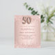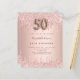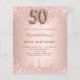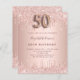 En modern, snyggt och glamorös inbjudan till 50:e födelsedagsfesten. En bakgrund i ro guld med ro guld droppar, färgdroppstift. Namn är skrivet med ett modernt skript för färgaden ro guld i mörk, skrivet med stil. Anpassa och lägg till information om party. Nummer 50 skrivs med ett stil-skript med ballong.