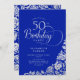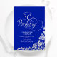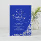 Enkel elegant 50 födelsedagsfest inbjudan i royal blå och silver. Klassdesign med ro, faux silver-folie och typsnitt för typsnitt. Trendig inbjudan-kortets perfekt för en snyggt kvinnlig dag firande. Anpassa med dina egna detaljer. Kan anpassas till vilken ålder som helst. Skrivna Zazzle-inbjudningar eller digital utskrivbar mall för omedelbar nedladdning.