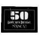 Det här tjugonde roddutseendet inspirerade vintage stil-presentsäcksdesignen har ett stort konst deco stil-inspirerat nummer "50", meddelandet "Lycklig 50:e födelsedag", ett eget namn och ett gräns mönster som består av tunt linjer. Den har en bakgrund med svart färgad. En presentpåse som denna kan användas när man slår in presenter som ges till någon i firande på deras 50-årsdag. [~Z0000495]