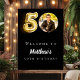Ett välkomsttecken för en 50:e födelsedagsfest. Svart bakgrund. Anpassa och lägg till namn och foto.