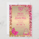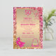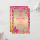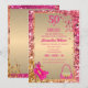 Modern och elegant, för inbjudan till 50-årsfirande för fashionista. Kvinnlig glamourös lyx guld metallisk folie falskt glitter rosa konfetti ram, vackra högklackade skor 👠 med slingor sitter i det vänstra hörnet och en söt och färgrik rosa guldpung 👛 sitter i det nedre högra hörnet, "50 & Fabulous" i rosa fuchsia på guld metallisk folie och baksidan