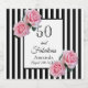 En etikett för 50:e födelsedagsfesten. Klassiskt smalt svart och vitt lodrät rand som bakgrund. Med giftigt och feminin rosa ros som dekoration. Ram framför med texten: 50 och Fabulous och mallar för namn och datum.