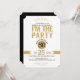 Elegant modern, söt 50:e födelsedagsfest inbjudan. Modern textdesign - jag är party i guld glitter, vit bakgrund och svarta accenter. Guld glitter ram. En del av jag är party-samlingen.