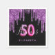 Ett trendig och en glamorös papper napkin med 50 födelsedagsfester. En klassisk svart bakgrund som dekoreras med mörkens lila färgad faux glitter drops, färgdropputseende. Med texten: 50 och fantastisk. Anpassa och lägg till ett namn. Lila och färgad. Ord Fabulous är skriven med ett modernt handskript i stil. Ålder 50 skrivs med ett skript för ballong stil.