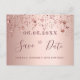 Ett feminin och glamoröst Spara datumkortet i 50 år gamla födelsedagsfester. En feminin rosa, ro guld faux metallisk tittar bakgrund som dekoreras med faux ro guld mousserande stjärnor. Mallar för ett datum och din text. Mörk ro guld färgad brev. Texten: Spara datumet skrivs med ett stort trendig-handskript i stil. Bakåt: ro guld. Mallar för information om party. Svart text.