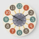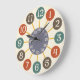 Den här roligtens klockdesign inspireras av 1950-talets atomklockor. Beige-talen finns i cirklar med olika vintagar av orange, brunt och tårblått. De spindlar ut från ett runt centrum i ett grått-nyans som räknas sekunderna/minuterna. Det är en enkel, djärv modern design i mitten av århundradet med en manlig känsla. Allt vilar på en antika beige bakgrund, men du kan anpassa den skuggan till vad du vill, så att klockan bättre matchar ditt hemdecorspel.