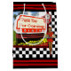 Medelstor svart presentväska med en bild på framsidan av en 50-sekunderssymbol som lyder: "Tack för att du kom", en röd middag och en 50-sekundersserver i vintagen på en svart och vit kontrollpanel. Dubbla Red rand gräns omringar väskan. Se hela den niottioåriga samlingen med gåvtaggar i de SPECIELLARE TUCHES| Avsnittet Party favors.