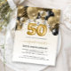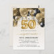 This festive 50th anniversary party invitation features a black and gold balloon arch garland over a gold faux foil balloon number "50" and black and gold ribbons and confetti. Personalize the text with the couple's names in elegant gold-colored handwriting script and the other party details in black on a pale gold ombre background.