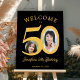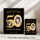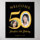 Elegant modern typography 50th birthday party photo and name personalized black and gold welcome sign printed or printable digital download poster. Easy to customize with your text and 2 then and now pictures.