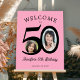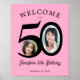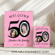 Elegant modern typography 50th birthday party photo and name personalized black and pink welcome sign printed or printable digital download poster. Easy to customize with your text and 2 then and now pictures.
