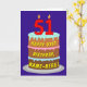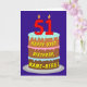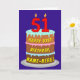 På framsidan av den här roligten och den populära versionen av gratulationskortet för födelsetalet finns en bild av en treskiktad födelsedagskalas med numeriska ljus överst som visar nummer "51", tillsammans med meddelandet "LYCKLIG 51ST BIRTHDAY," och en personlig mottagare av namn. Insidan har ett hälsning-meddelande på personligens födelsedag, eller kan kanske tas bort och lämnas tomt om ett meddelande ska skrivas för hand i stället. Ett glatt, redigerbart födelsedag som detta kan vara ett roligt sätt att leverera önskemål till någon som firar sin femtioförsta födelsedag. [~Z0000620]