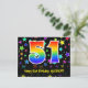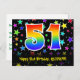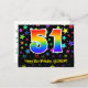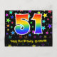 Framsidan av denna spännande, roliga och färgglada födelsedagstemanpassade vykortdesign har en stor siffra "51" med ett regnbågsspektrum-gradering-inspirerat mönster. Den har också meddelandet "Grattis på 51-årsdagen," och ett anpassningsbart mottagarnamn. Framsidan har dessutom ett färgglatt och livfullt mönster av stjärnformer. Baksidan har ett personligt födelsedags-hälsningsmeddelande, eller skulle kunna tömmas och lämnas tom om ett meddelande ska skrivas för hand istället. Ett personligt födelsedagsvykort som detta kan vara ett roligt sätt att skicka ett meddelande för att fira någons 51-årsdag. Vykort som detta kan också användas för att bjuda in gäster till en födels