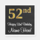 Denna lyxiga, snyggt och sofistikerade pappra napkin-design för födelsedagar har ett stort ordnummer "52nd" med ett imitation/faux-guld-liknande utseende, plus hälsning-födelsedagsmeddelandet "Lycklig 52nd Birthday" och ett eget namn i ett skript-stil-teckensnitt. Bakgrunden är svart på färgad. Elegantens födelsedag skulle pappra blöjor som denna kunna användas vid party i firande på någons 52-årsdag. [~Z0000516]