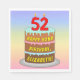 Den här färgfulla och roligt pappra napkindesignen har en tecknad-stil-bild av en treskiktad födelsedagskalas med numeriskt formade ljus ovanpå som visar siffran "52", tillsammans med meddelandet "LYCKLIG 52ND BIRTHDAY," och en redigerbar mottagare namn. Bakgrunden har en gradient mönster som är inspirerad av skalan för pastellregnbåge med flera färg. Skyvliga födelsedag sådana pappra blöjor kan användas vid party i firande på någons 52-årsdag. [~Z0000623]