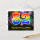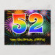 Framsidan av denna spännande, roliga och färgglada födelsedagskortdesign har en stor siffra "52" med ett regnbågsspektrum-gradering-mönster. Den har också texten "Grattis på 52-årsdagen," och ett redigerbart mottagarnamn. Framsidan har dessutom ett färgglatt och livfullt sprängande firande fyrverkeri-inspirerat bakgrundsmönster. Baksidan har ett anpassat födelsedagsgratulationsmeddelande, eller kan kanske rensas och lämnas tomt om ett meddelande ska skrivas för hand istället. Ett personligt födelsedagskort som detta kan vara ett roligt sätt att erkänna någon på deras femtioandra födelsedag. Kort som detta kan också användas för att bjuda in gäster till en födelsedagsfest eller kalas som
