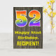 Framsidan av denna färgrika men ändå rustika födelsedagsgratulationskortdesign har en stor siffra "52" med ett regnbågsspektrum-gradering-mönster, tillsammans med meddelandet "Grattis på 52-årsdagen," och ett personligt mottagarnamn. Framsidan har en bakgrund som visar ett rustikt falskt trästrukturmönster. Insidan har ett anpassat födelsedagsgratulationsmeddelande, eller kanske kan vara tom om ett meddelande ska skrivas för hand istället. Ett personligt födelsedagskort som detta kan vara ett roligt sätt att fira någons femtioandra födelsedag.