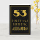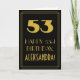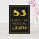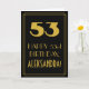 Denna födelsedagskortdesign med vintageutseende inspirerad av 1920-/1930-talsstil har på framsidan ett stort antal "53" med art déco-look, texten "GRATTIS PÅ 53-ÅRSdagen", ett redigerbart namn och ett kantmönster bestående av linjer. Framsidan har också en svart bakgrund. Insidan har ett redigerbart födelsedagsmeddelande, eller så kan det lämnas tomt om man istället vill skriva ett meddelande för hand. Ett personligt födelsedagskort som detta kan vara ett roligt sätt att skicka födelsedagsönskningar till någon som firar sin 53:e födelsedag.