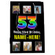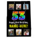 Denna roliga och glada födelsedagspresentväska har en stor siffra "53" med ett livfullt regnbågsspektrum-inspirerat övergångsmönster, plus meddelandet "Grattis på 53-årsdagen" och en anpassad mottagares namn. Fotografierna ovanför och nedanför meddelandet kan anpassas, kanske med foton av mottagaren, mottagarens familj och vänner och/eller givaren/ givarna av presenten. En glädjefull födelsedagstematisk presentväska som denna kan användas när man ger en present eller gåva i samband med någon persons femtioårsdag. (Foto © Storytree Studios, Stanford, CA.)
