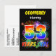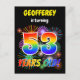 Framsidan på denna roliga och livfulla födelsedagsfest inbjudan vykort design har ett anpassningsbart namn, ett spännande sprängande fyrverkerier inspirerat mönster och meddelandet "53 ÅR GAMMAL!" med ett färgrikt regnbågsspektrum inspirerat övergångsmönster. Baksidan har ett redigerbart meddelande med information om festen, till exempel när och var den äger rum. Inbjudningskort som detta kan skickas till potentiella deltagare på en födelsedagsfest som hålls för att fira någon som fyller 53. [~Z0000452]