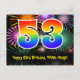 Den främre delen av denna roliga, färgglada och spännande födelsedagstemanpassade vykortdesign har en stor siffra "53" med ett regnbågsspektrum-gradering inspirerat mönster, tillsammans med meddelandet "Grattis på 53-årsdagen", och ett personligt mottagarnamn. Framsidan har dessutom ett livfullt och färgglatt bakgrundsmönster inspirerat av utseendet på sprängande festliga fyrverkerier. Baksidan har ett redigerbart födelsedagsgratulationsmeddelande, eller kanske kan rensas och lämnas tomt om ett meddelande ska skrivas för hand istället. Ett födelsedagsvykort som detta kan vara ett roligt sätt att skicka födelsedagsönskningar till någon som firar sin femtioårsdag. Vykort som detta kan också användas för att