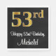 Den här snyggten, den sofistikerade och lyxiga födelsedagstecknet papper napkin-design har ett stort ordnummer "53:e" med ett utseende som inspirerats av imitation/faux guld, tillsammans med hälsning-födelsedagstecknet "Lycklig 53:e födelsedagen" och ett eget namn i ett typsnitt av typen manus-stil. Bakgrunden är svart på färgad. Pappra servetter som denna kan användas när man firar någons femtiotredje födelsedag. [~Z0000516]