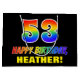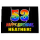 Den här roligten, den roliga och färglösa presentväskan har ett stort nummer "53" och meddelandet "GRATTIS PÅ FÖDELSEDAGEN,", som båda har en regnbågsspektrumövertoning som inspirerade mönster-färgning, tillsammans med en fetstilt gult som kan redigeras av namn. Bakgrunden är svart på färgad. En sådan här presentpåse på roligtens födelsedag kan användas när en gåva eller present i firande på någons 53-årsdag är ge. [~Z0000477]