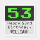 Den pappra napkin-designen med hög roligt och hög födelsedagskalender har en stor grönt för videospel med stil nummer 53 på en svart färgad. Det innehåller också hälsning:s födelsedagsmeddelande "Lycklig 53:e födelsedagen" och ett namn som kan redigeras. Roligt och nonsens pappra blöjor som denna kan användas vid en party som hålls för att fira femtiotredje årsdagen av en datorhistoriker, en vetenskapsman eller någon som verkligen gillar datorspel. [~Z0000404]
