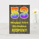 Framsidan av denna färgstarka men rustiska födelsekortsdesign har ett stort nummer "53" med en regnbågsspektrumövertoning som inspirerade mönster, tillsammans med meddelandet "Lycklig 53:e födelsedagen" och en anpassade-mottagare namn. På framsidan finns en bakgrund som skildrar ett rustiskt faux-träkorn som ser ut mönster. Insidan innehåller ett hälsning-meddelande från anpassadets födelsedag, eller kan kanske tas bort och lämnas tomt om ett meddelande ska skrivas för hand i stället. Ett sådant här födelsedagskort i anpassadet kan vara ett roligt för att fira någons femtiotredje årsdag. [~Z0000419]