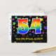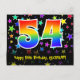 Framsidan av denna roliga och färgglada födelsedagskortdesign har en stor siffra "54" med ett regnbågsspektrum-gradering-mönster, tillsammans med meddelandet "Grattis på 54-årsdagen," och ett anpassningsbart mottagarnamn. Framsidan har dessutom ett färgglatt och livfullt mönster av stjärnformer. Baksidan har ett anpassat födelsedagsmeddelande, eller kanske kan rensas och lämnas tomt om ett meddelande ska skrivas för hand istället. Ett anpassningsbart födelsedagskort som detta kan vara ett roligt sätt att fira någon på deras femtiofjärde födelsedag. Vykort som detta kan också användas för att inbjuda gäster till en födelsedagsfest eller firande som hålls för någon som fyller 54 år.