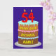 Framsidan av detta uppsvällda och trevliga födelsekortsformat ger en bild av en treskiktad födelsedagskalas med sifferformade ljus ovanpå som visar åldern 54 år, tillsammans med meddelandet "LYCKLIG 54:e BIRTHDAY," och en redigerbar mottagare namn. Insidan har ett hälsning-meddelande på personligens födelsedag, eller kan kanske tas bort och lämnas tomt om ett meddelande ska skrivas för hand i stället. Ett glatt hälsningskort för personliger som detta kan skickas för att fira någons femtiofjärde födelsedag. [~Z0000620]