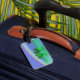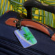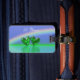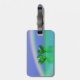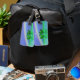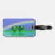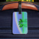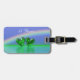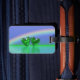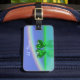 Bagagetaggen med mina teckningar av två framväxande gröntar flytande på vatten under en regnbåge. Texten säger "55 år".