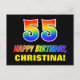 Framsidan av den här roligten, den roliga och färglösa födelsedagskalemat med vykort har ett stort nummer "55" och meddelandet "GRATTIS PÅ FÖDELSEDAGEN,", båda färgader med en regnbågsspektrumövertoning inspirerade mönster, tillsammans med en fet gult personlig mottagare namn. Framsidan har också en minimal, enkel, svart färgad. Baksidan av vykortet innehåller ett hälsning-meddelande från anpassningsbarnas födelsedag, eller så kan det kanske rensas och lämnas tomt om ett meddelande ska skrivas för hand i stället. Ett så pass dynamiskt vykort för anpassadets födelsedag kan vara ett roligt för att erkänna någons femtiofemårsdag. [~Z0000474]