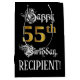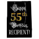 Den här ornitade och opulenta presentsäcksdesignen med födelsedagstext innehåller budskapet "Lycklig 55:e födelsedag", plus en personlig som tar emot namn. En del av meddelandet finns i en utförlig text med skript-stil. Det stora antalet "55:e" har ett faux/imitation guld-inspirerat utseende mönster. Bakgrunden är svart på färgad. En dylik födelsedagsäck kan vara ett respektabelt sätt att figurera en gåva eller present som ges för att fira någons femtiofemårsdag. [~Z0000560]
