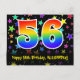 Framsidan av denna spännande, färgstarka och roligt födelsedag med vykort har ett stort nummer "56" med en regnbågsspektrumövertoning som inspirerade mönster. Det innehåller också budskapet "Lycklig 56:e födelsedag" och en anpassningsbar som tar emot namn. På framsidan finns dessutom en färgstark och livfull bakgrund med en mönster av stjärnformer. Baksidan innehåller ett anpassat födelsedagsmeddelande från hälsning, eller så kan det kanske rensas och lämnas tomt om ett meddelande ska skrivas för hand i stället. Ett sådant här vykort för personligens födelsedag kan vara ett sätt att skicka ett roligt för att fira någons femtiosjätte födelsedag. Sådana vykort kan också användas för gäster från inbjudan till en födelsedagsfest eller firande som hålls i förvar för någon som blir 56 år gammal. [~Z0000447]