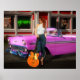 Vackra kvinnor framför en 50:s middag och en 1956 konvertibel bil som håller henne Rockabilly guitar