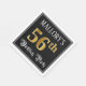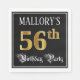 This elegant and opulent birthday paper napkin design features a customizable name and the message “56th Birthday Party”. The large number “56th” has a faux/imitation gold-inspired coloring pattern, the words “Birthday Party” are in fancy script-style text, and the background is colored black by default (although it can be customized). Fancy, ornate paper napkins like this might be used at a birthday party/celebration being held to celebrate somebody’s fifty sixth birthday. [~Z0000565]