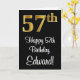 Den här eleganten, en sofistikerad och lyxig hälsningskort med födelsedag har ett stort ordnummer "57:e" som har ett imitation/faux-guld-inspirerat utseende, tillsammans med hälsning-födelsedagsmeddelandet "Lycklig 57:e födelsedagen" och ett anpassade namn i ett skript-stil-teckensnitt på framsidan. Bakgrunden till framsidan är svart färgad. Insidan har ett hälsning-meddelande på personligens födelsedag, eller kan kanske tas bort och lämnas tomt om ett meddelande ska skrivas för hand i stället. Ett sådant här redigerbart födelsedag kan vara ett roligt för att ge ett hälsning-födelsedagsmeddelande till någon som firar sin femtiosjunde födelsedag. [~Z0000518]