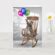 Spelande tabby katt står på en rockande trästol och når en färgfull ballongbukett för 57-årsdagen. Åldersnumret kan ändras.