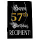 This opulent and luxurious birthday-themed giftbag design features the message “Happy 57th Birthday,”, along with an editable recipient name. Part of the message is in an elegant script-style text. The large number “57th” features a faux/imitation gold-inspired look pattern. The background is colored black. A gift-bag like this might be used when wrapping gifts being given to somebody in celebration of their fifty seventh birthday. [~Z0000560]