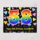 Framsidan av denna färgglada, roliga och kärleksfulla födelsedagskortdesign har en stor siffra "58" med ett regnbågsspektrum-gradering inspirerad design. Den har också texten "Grattis på 58-årsdagen," och ett personligt mottagarnamn. Framsidan har dessutom ett färgglatt och livfullt mönster av kärleksfulla hjärtan. Baksidan har ett anpassat födelsedags-hälsningsmeddelande, eller kan eventuellt lämnas tomt om ett meddelande ska skrivas för hand istället. Ett personligt födelsedagskort som detta kan vara ett roligt sätt att skicka ett meddelande för att fira någon som fyller 58 år. Postkort som detta kan också användas för att bjuda in gäster till en födelsedagsfest som hålls för någon som