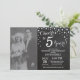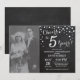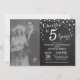 5-års bröllopsdag med eget foto. Kritskrifttavla svart och silver inbjudan. Femte bröllopsdagen. Kritskrifttavla svart och silver glitter diamantbakgrund. Silverkonfetti. Vuxen födelsedag. Kvinna eller man manlig födelsedagsfest. För ytterligare anpassning, klicka på "Anpassa"-knappen och använd vårt designverktyg för att ändra denna mall.