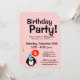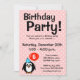 5-års födelsedagsinbjudningar med rolig pingvin-tecknad film. Anpassade inbjudningar för barns födelsedagar och andra roliga tillfällen. Anpassningsbar annons text, ålder nummer och bakgrundsfärg. Flickaktig rosa bakgrund med vit prickmönster. Mall för barns femte födelsedag. Åldersspecifik, för femårig flicka.