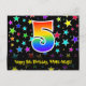 Framsidan av denna roliga och färgglada födelsedagskortdesign har en stor siffra "5" med ett regnbågsspektrum-gradering-mönster. Den har också texten "Grattis på 5-årsdagen" och ett personligt mottagarnamn. Framsidan har dessutom ett livfullt och färgglatt stjärnformsmönster i bakgrunden. Baksidan har ett personligt födelsedagsgratulationsmeddelande, eller kan eventuellt lämnas tom om ett meddelande ska skrivas för hand istället. Ett personligt födelsedagskort som detta kan vara ett roligt sätt att gratulera någon på deras femte födelsedag. Postkort som detta kan också användas för att inbjuda gäster till en födelsedagsfest som hålls för någon som fyller 5 år.